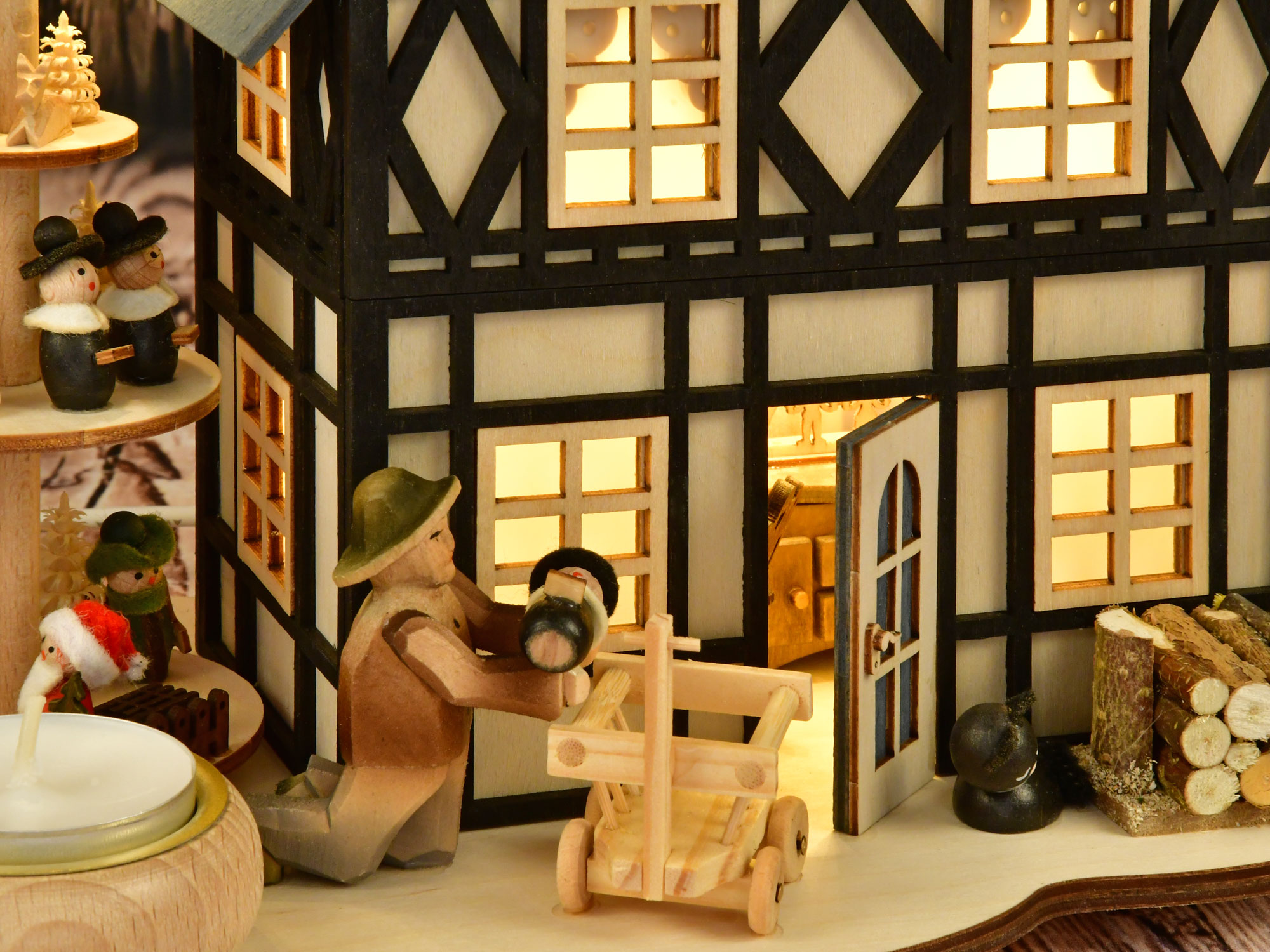 Denne pyramiden i bindingsverksstil er vakker å se på. Den er utstyrt med mange kjærlige detaljer. Pyramiden drives av to tente telys som plasseres i de medfølgende telysholderne i massivt tre. LED-belysningen skaper en stemningsfull atmosfære i rommet.
