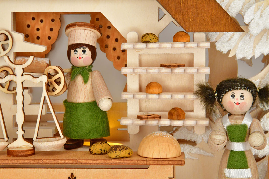 De bakkerij staat midden in een fijn dennenbos dat uit berkenmultiplex is gezaagd. Drie Ratags-massiefhouten figuren, uitgerust met mutsen en schorten, zijn druk bezig bij de houtoven, in de keuken en aan de toonbank. Deze 3D-kerstboog uit het Ertsgebergte bevat veel liefdevol ontworpen en met de hand geschilderde details, zoals een deegroller, een zeef, een keukenweegschaal, een bakkom, een meelzak met karretje en natuurlijk veel lekkere bakproducten. De indirecte ledverlichting zorgt voor een sfeervolle ambiance. Glitterende rijp maakt dit handwerk uit het Ertsgebergte helemaal af.