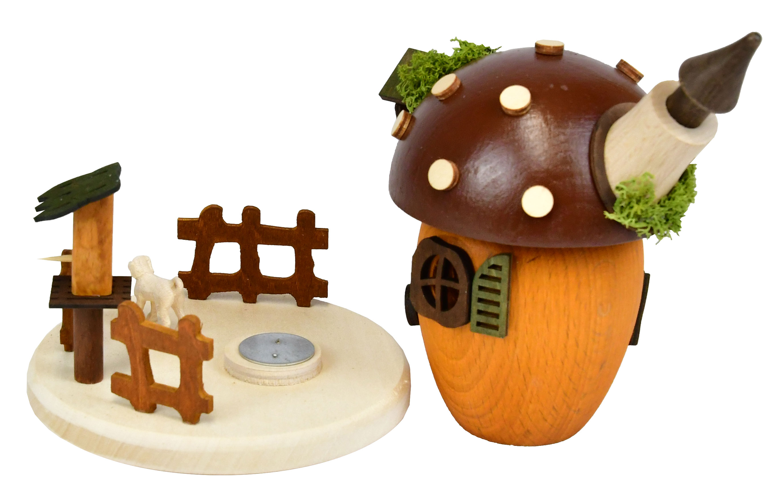 Mooie wierookpaddenstoel. De wierookpaddenstoel is versierd met een raam, deur, vogeltjes en een hekje.