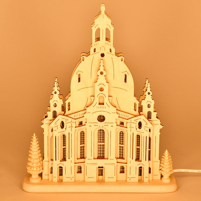 Afbeelding van de Frauenkirche in Dresden aan de Neumarkt in berkenmultiplex met ingebouwde LED-verlichting. De USB-voeding maakt een decentrale of mobiele opstelling mogelijk, bijvoorbeeld via een powerbank. Een echte blikvanger en een geweldig souvenir van RATAGS