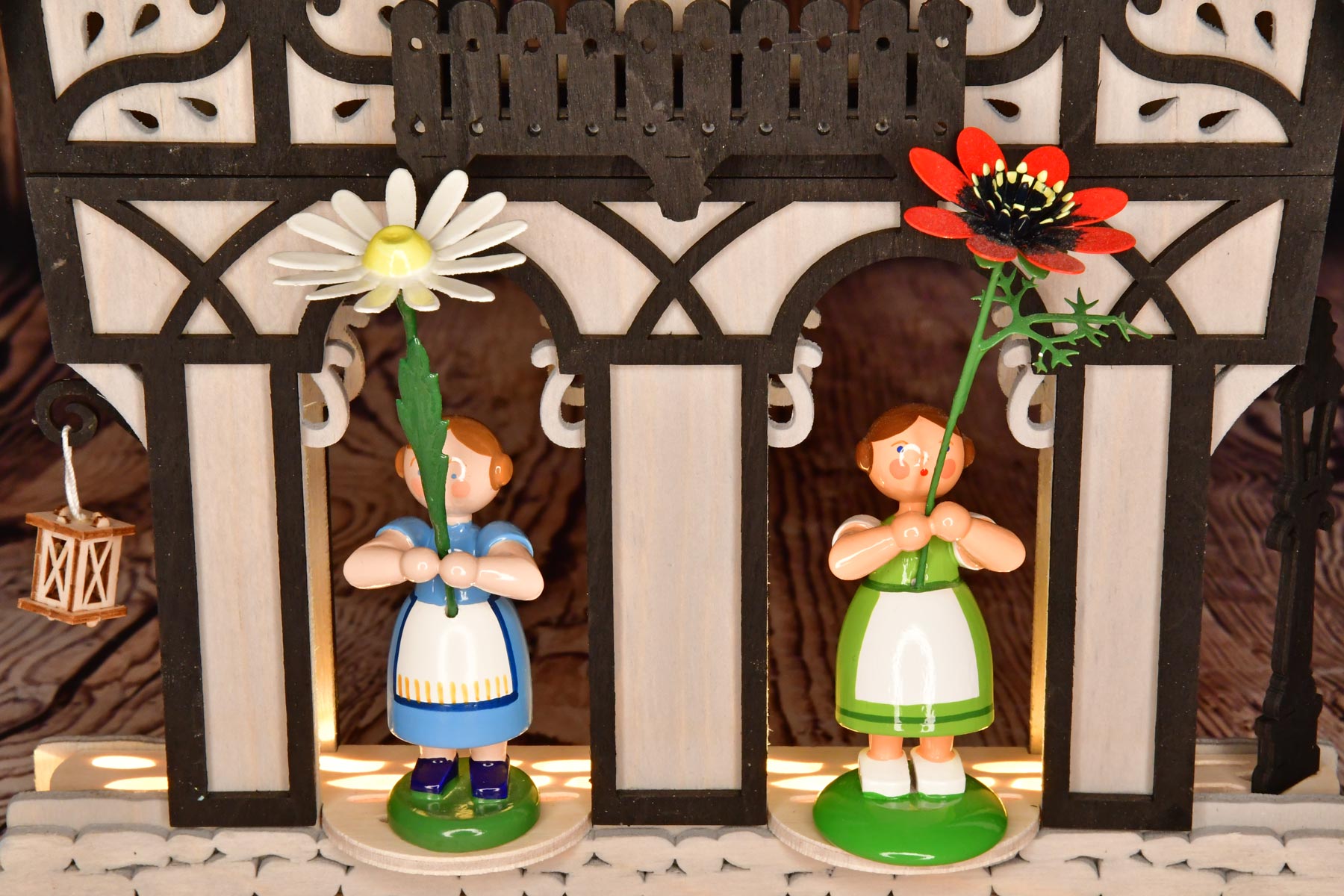 Dekoracyjne domki z muru pruskiego w czterech różnych kolorach, odpowiednie dla figurek kolekcjonerskich, oświetlone taśmą LED. Filigranowa konstrukcja szachulcowa wyraźnie wyróżnia się na tle kolorowych fasad i kontrastuje z dachami w różnych kolorach. Domki są równie starannie zaprojektowane z obu stron. Zasilanie USB umożliwia zdecentralizowane ustawienie.