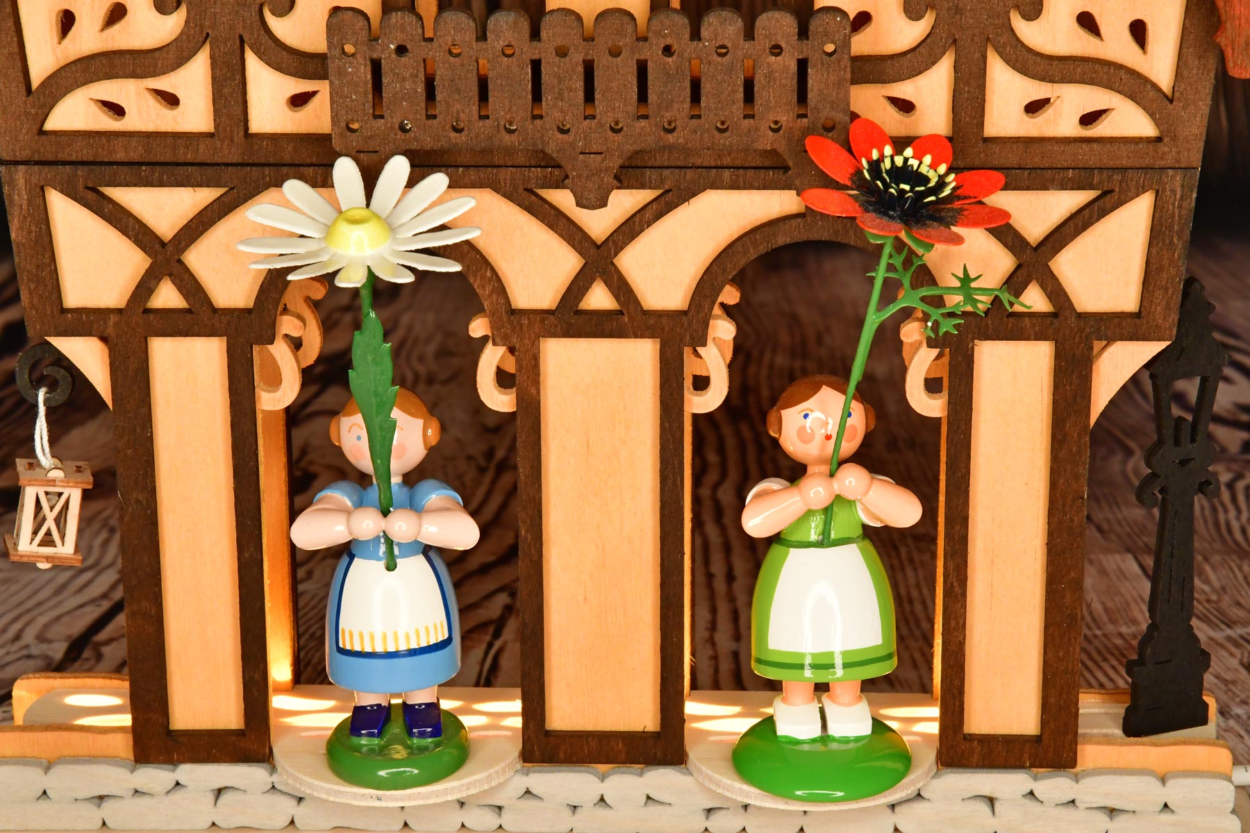 Dekoracyjne domki z muru pruskiego w czterech różnych kolorach, odpowiednie dla figurek kolekcjonerskich, oświetlone taśmą LED. Filigranowa konstrukcja szachulcowa wyraźnie wyróżnia się na tle kolorowych fasad i kontrastuje z dachami w różnych kolorach. Domki są równie starannie zaprojektowane z obu stron. Zasilanie USB umożliwia zdecentralizowane ustawienie.