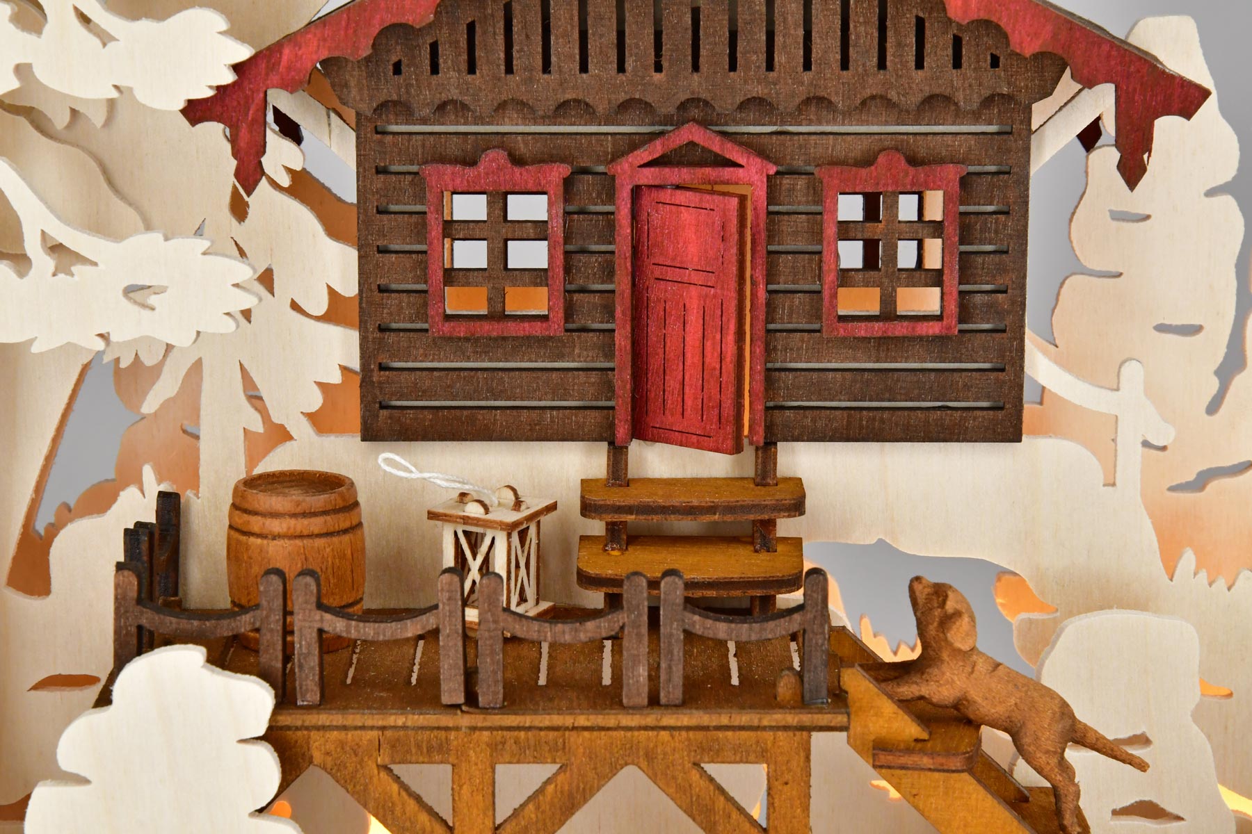 Być może nasz miłośnik przyrody wynajął górską chatę. Znajduje się ona w Górach Połabskich, w Szwajcarii Saksońskiej. Taras zachęca do spędzenia kilku chwil w kontakcie z naturą, wydaje się, że słychać śpiew ptaków. Wesoły piesek wskakuje po schodach. Tuż pod chatą znajdują się szlaki turystyczne prowadzące do atrakcyjnych miejsc. W oddali widać Lilienstein i Zirkelstein nad Łabą. Figurki są wykonane z litego drewna i pomalowane na kolorowo.