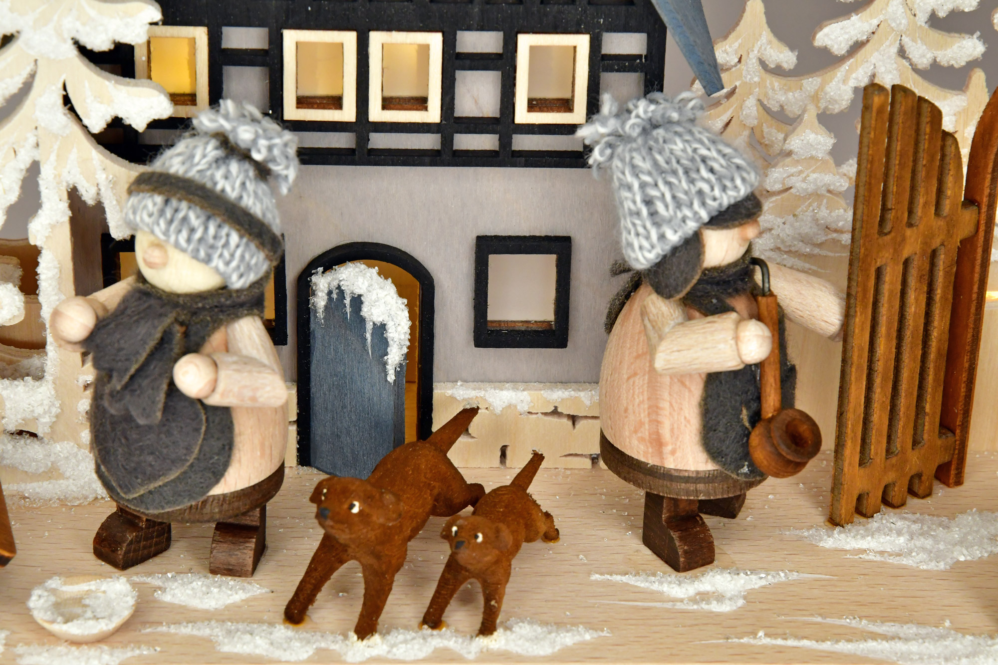 Rozmiar: 43 x 30 cm (szer. x wys.) Oświetlenie: LED, 10-częściowe Ten podwójny łuk świąteczny przedstawia rodzinę przygotowującą się do Bożego Narodzenia. Mężczyzna przynosi do domu świeżo ścięte drzewko, a kobieta zamiata podwórko. Pośrednie, nieoślepiające oświetlenie zapewnia nastrojową atmosferę w pomieszczeniu. Prawdziwa ręczna robota firmy RATAGS – wyprodukowana w Niemczech – w 100% oryginalna z Rudaw.