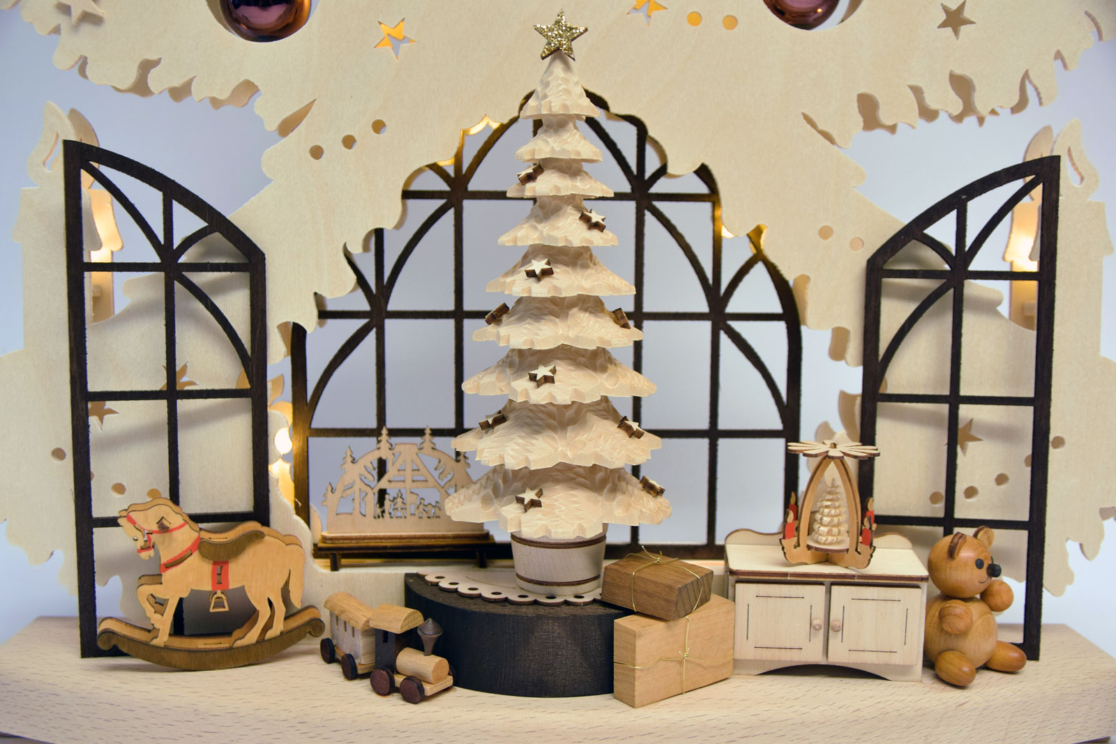 Uma novidade cuidadosamente concebida pela RATAGS. Este elaborado trabalho em contraplacado de bétula mostra uma sala de estar natalícia. Em frente a uma janela cheia de clima, tem uma árvore de Natal esculpida. Um arco de luz na janela e vários presentes completam a cena. O visual elegante do abeto vem do uso de tons parecidos, até mesmo o tom cobre das bolas da árvore combina com essa paleta de cores quentes. Uma iluminação LED indireta embutida e sem brilho cria efeitos de luz maravilhosos e vai transformar a sua sala numa sala de Natal. Uma bela peça de arte em madeira dos Montes Metálicos para a época mais escura do ano.