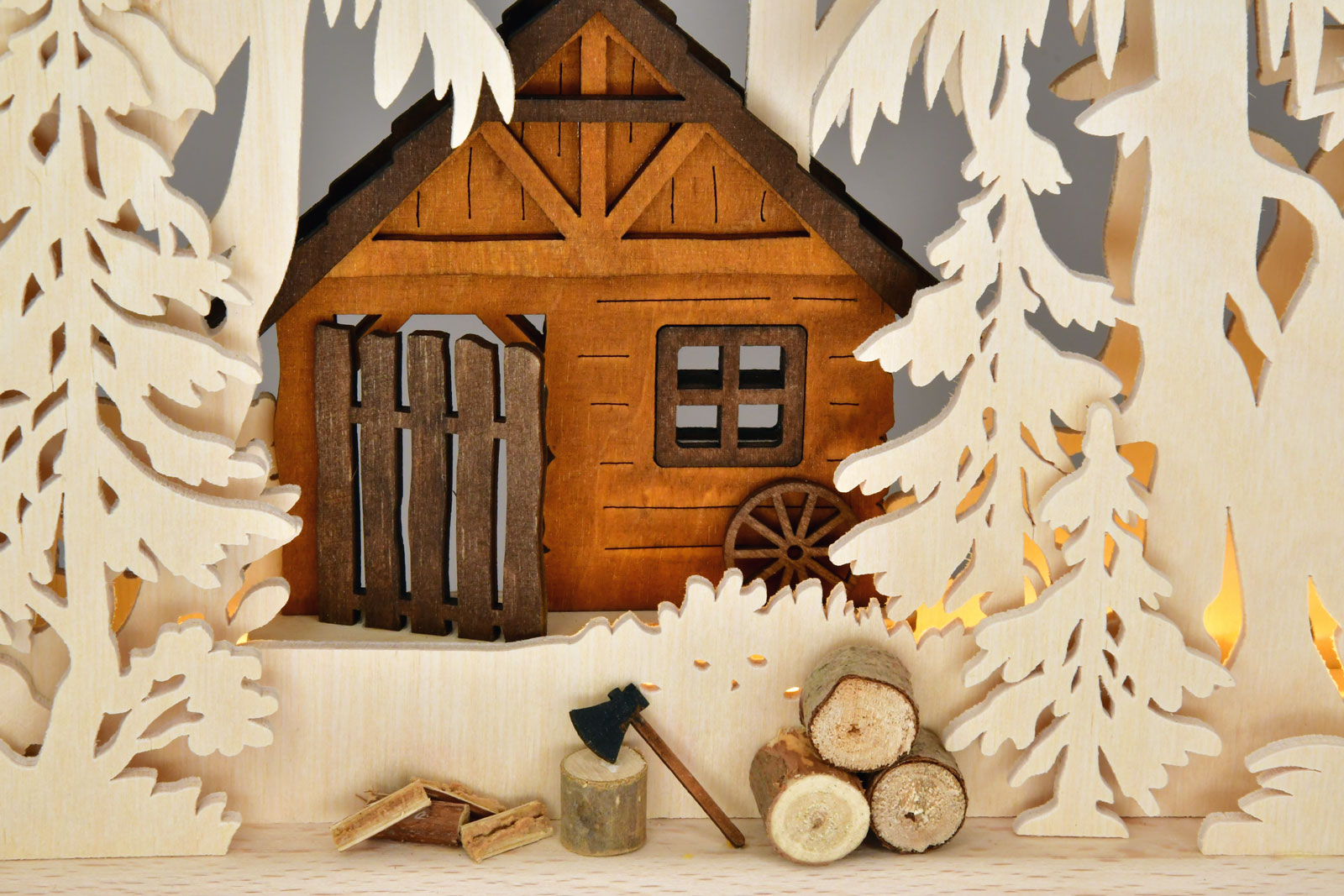 No meio de uma floresta densa está a cabana de um lenhador. A fumaça sobe da chaminé e transmite aconchego. O machado, o tronco e a lenha na frente da casa mostram que o trabalho já começou. E aí vem o dono da casa nos esquis. Ele traz lenha fresca no seu carrinho. Este arco luminoso RATAGS de compensado de bétula tem iluminação indireta e cria um clima legal no ambiente. A figura é feita de madeira maciça e pintada com corante.