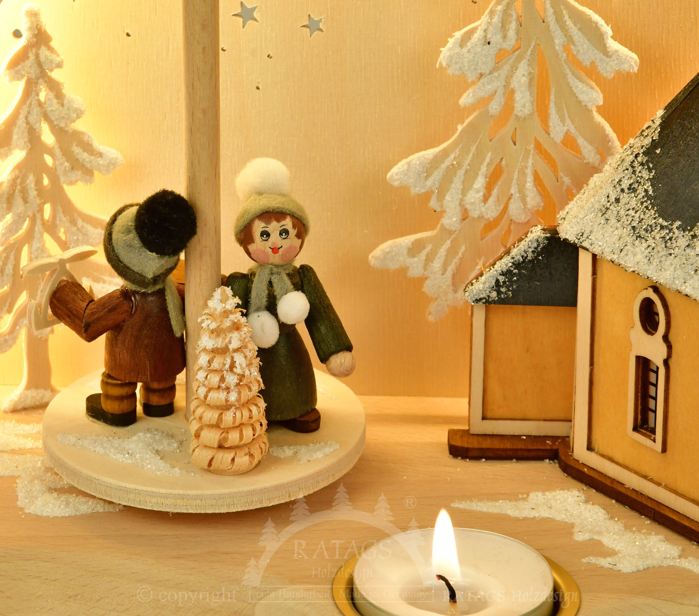 Este arco de luz RATAGS vem com uma pirâmide de verdade e mostra a marcante igreja da montanha Seiffener Bergkirche em frente a um arco iluminado. Na base da pirâmide, duas figuras de madeira maciça oferecem produtos natalinos. Um cachorrinho animado também faz parte do conjunto. A pirâmide é acionada por duas velas para velas de chá. A iluminação elétrica é alimentada por um cabo USB. Uma fonte de alimentação está incluída no pacote.