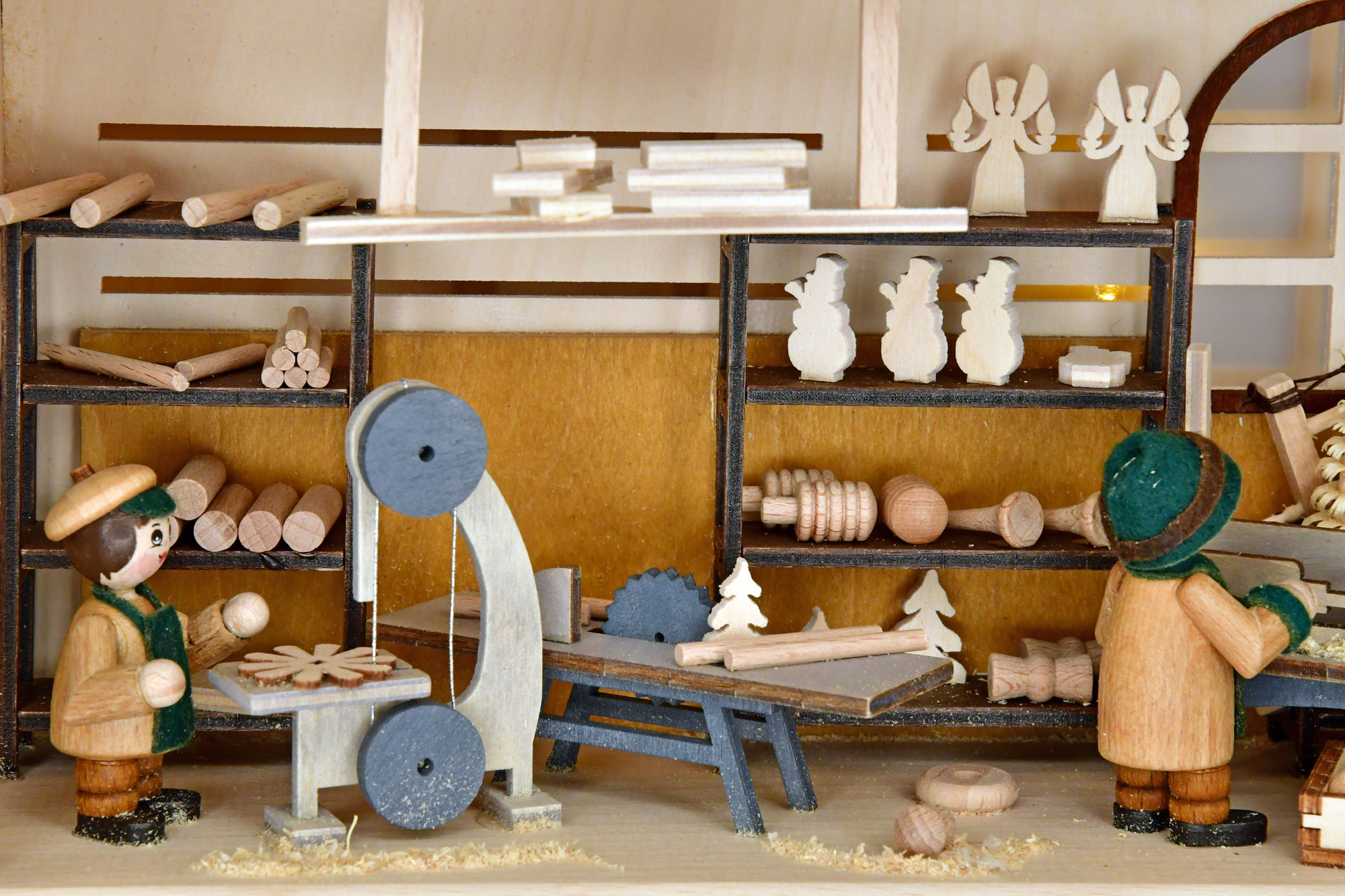 Uma oficina detalhada dos Montes Metálicos como uma casa iluminada da RATAGS. Em dois andares, três salas mostram todas as etapas imagináveis de uma oficina de arte em madeira, como trabalhos de entalhe e torneamento, bem como trabalhos com serras circulares, de fita e de marchetaria, até a montagem final e pintura. Várias serras manuais, uma furadeira e um formão também fazem parte do equipamento. Produtos acabados e semiacabados estão prontos para processamento em prateleiras, o depósito de madeira está bem abastecido e, em frente à casa, há material fresco armazenado até atingir a maturidade.