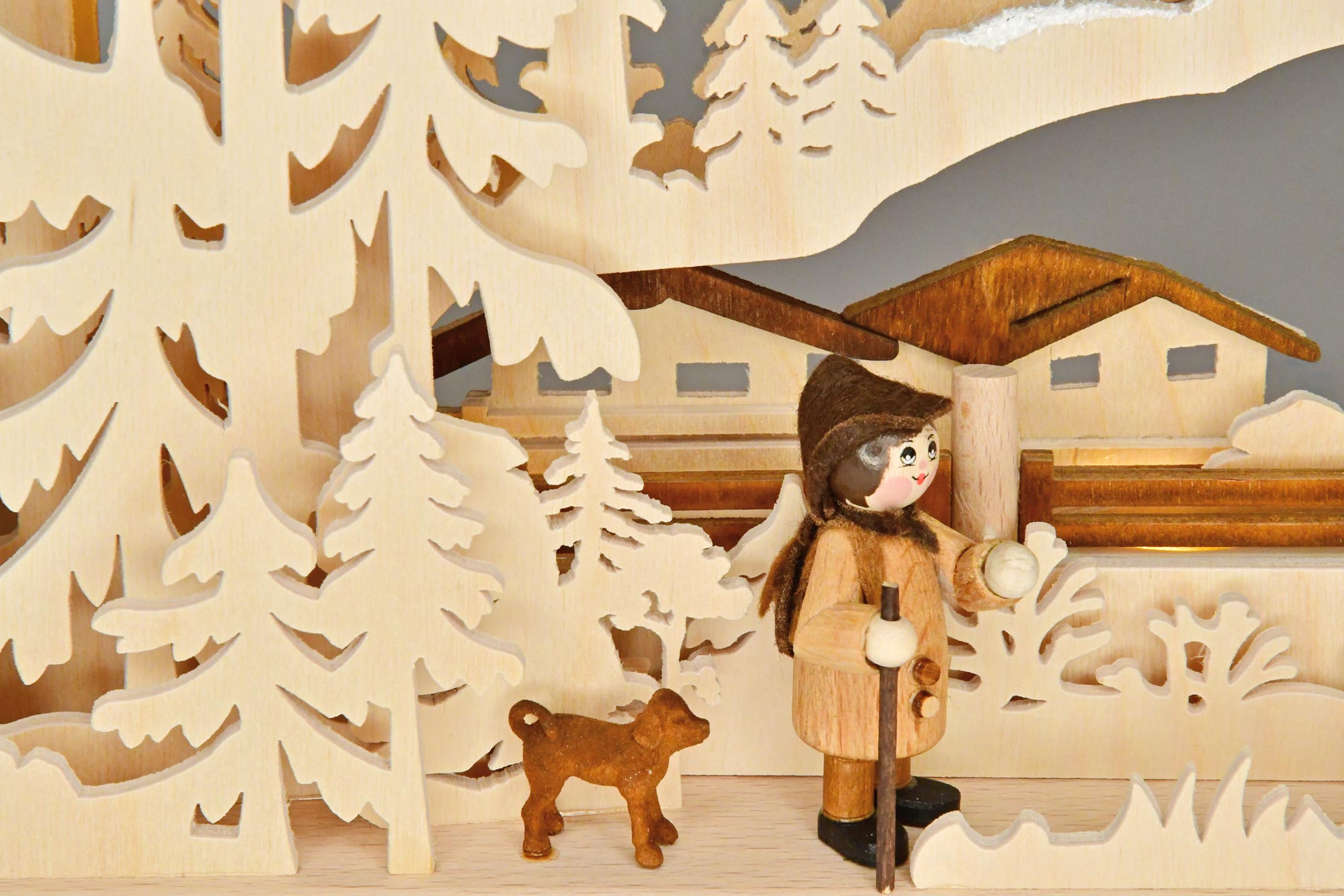 Storlek: 43 x 30 cm (BxH) LED-belysning Ett korsvirkeshus mitt i Erzgebirge, i utkanten av leksaksbyn Seiffen, inspirerade huset RATAGS till detta handarbete från Erzgebirge. De två figurerna, hunden, de snidade rådjuren med foderkrubba, träkärran och de betnade taken gör den 3D-svängda bågen med indirekt belysning till en konstnärlig dekoration. Äkta hantverk från RATAGS – Tillverkat i Tyskland – 100 % original från Erzgebirge