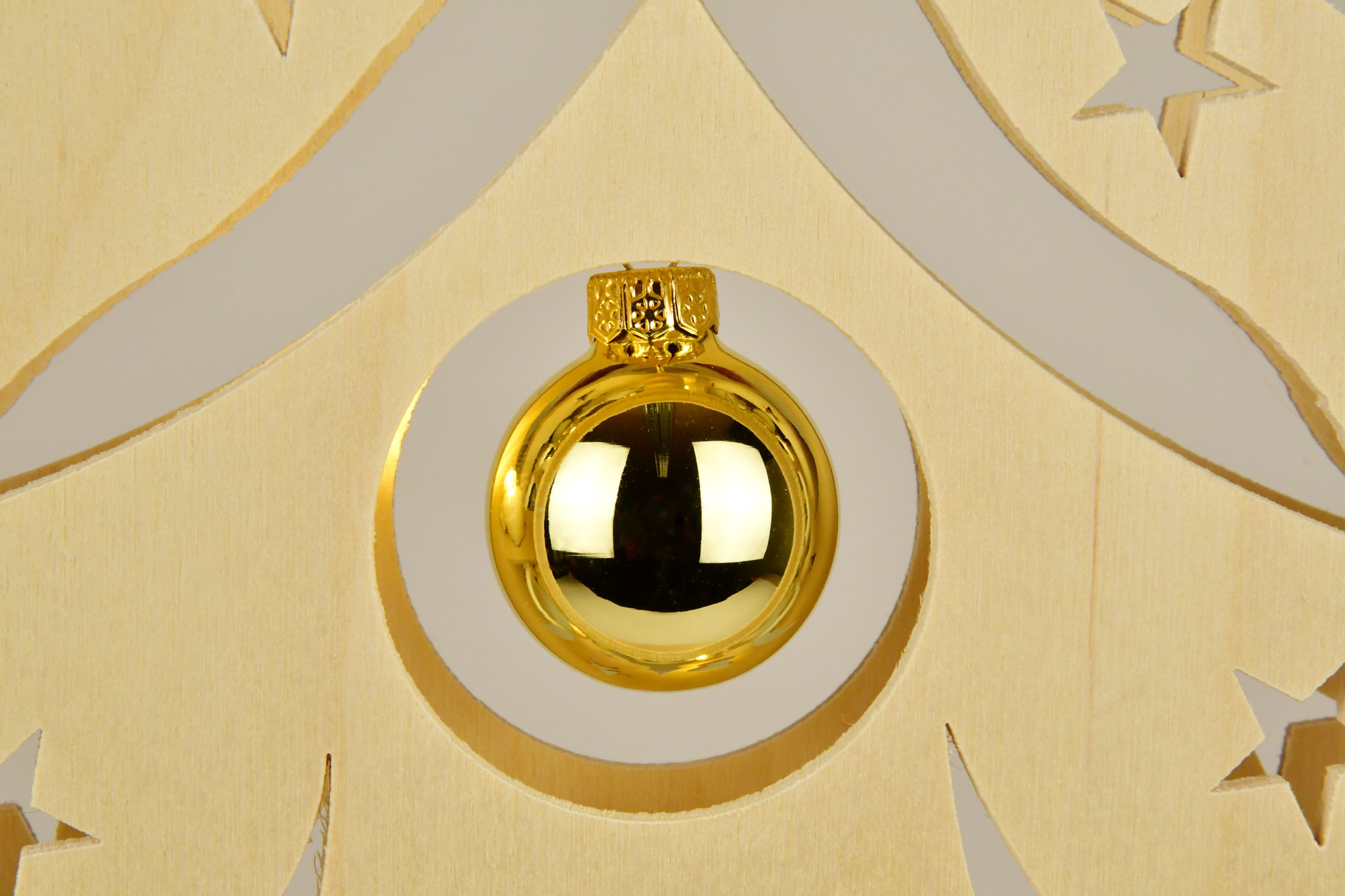 Storlek ca 23,5 x 33,5 x 5 cm (BxHxD) Belysning: 10-lampa LED-ljusslinga, full USB- Utförande: grönt betsade, gröna kulor Dekorativ gran av björkplywood med äkta glaskulor. Den bländfria LED-belysningen sprider ett stämningsfullt ljus. Granen är grönbetsad. USB-strömförsörjningen kan ske via powerbank, vilket möjliggör en nätoberoende installation. Äkta handarbete från RATAGS – Tillverkad i Tyskland – 100 % original från Erzgebirge