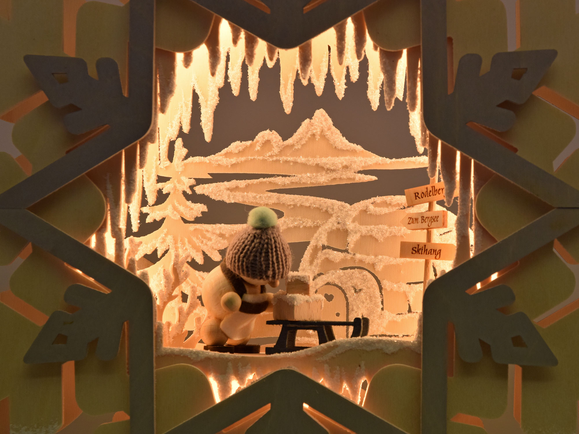 Storlek: ca 36 x 36 x 5 cm (BxHxD) Belysning: LED-remsa Björkfanér Denna fönsterbild av björkfanér i form av en snökristall med den kultförklarade TV-stjärnan Pitti sprider, upphängd i fönstret, ett stämningsfullt ljus både inåt och utåt. En färgglad Pitti kommer glatt åkande på kälke in i mitten av fönsterbilden. Två skyltar visar vägen till vintersportaktiviteterna. Äkta hantverk från RATAGS – Tillverkat i Tyskland – 100 % original från Erzgebirge.