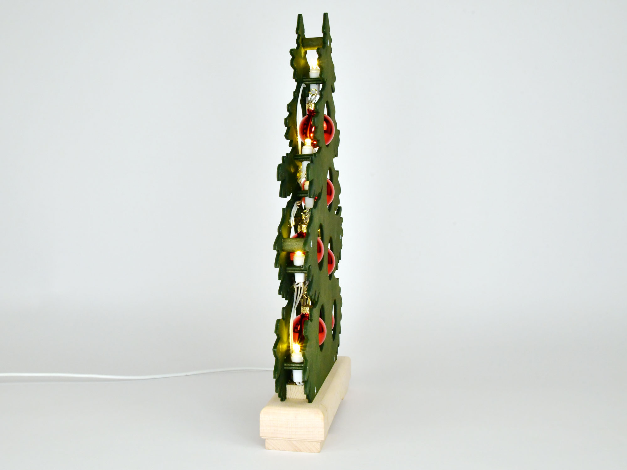 Dekorativ gran av björkplywood med äkta glaskulor. Den bländfria LED-belysningen sprider ett stämningsfullt ljus. Granen är grönbetsad. USB-strömförsörjningen kan ske via powerbank, vilket möjliggör en nätoberoende installation.