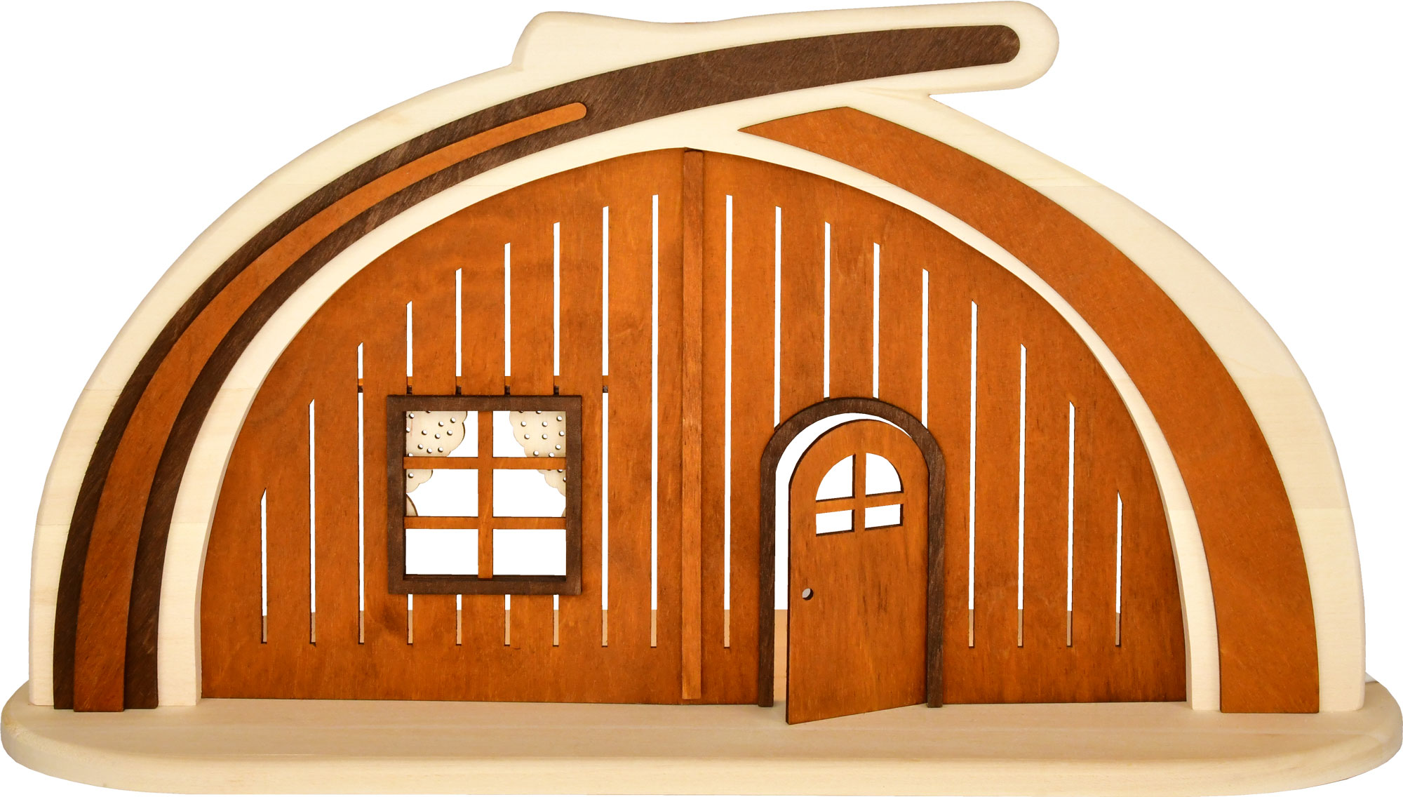 En massiv träbåge med LED-belysning visar julklappsutdelningen på julafton i det varma vardagsrummet. Den handskurna granen med kulor, många leksaker som nalle, gunghäst och järnväg tillsammans med höjdpunkter från Erzgebirge som Schwibbogen, änglar och pyramid skapar en mysig och vacker julstämning. Även katten vid den varma vedspisen bidrar till den hemtrevliga atmosfären.