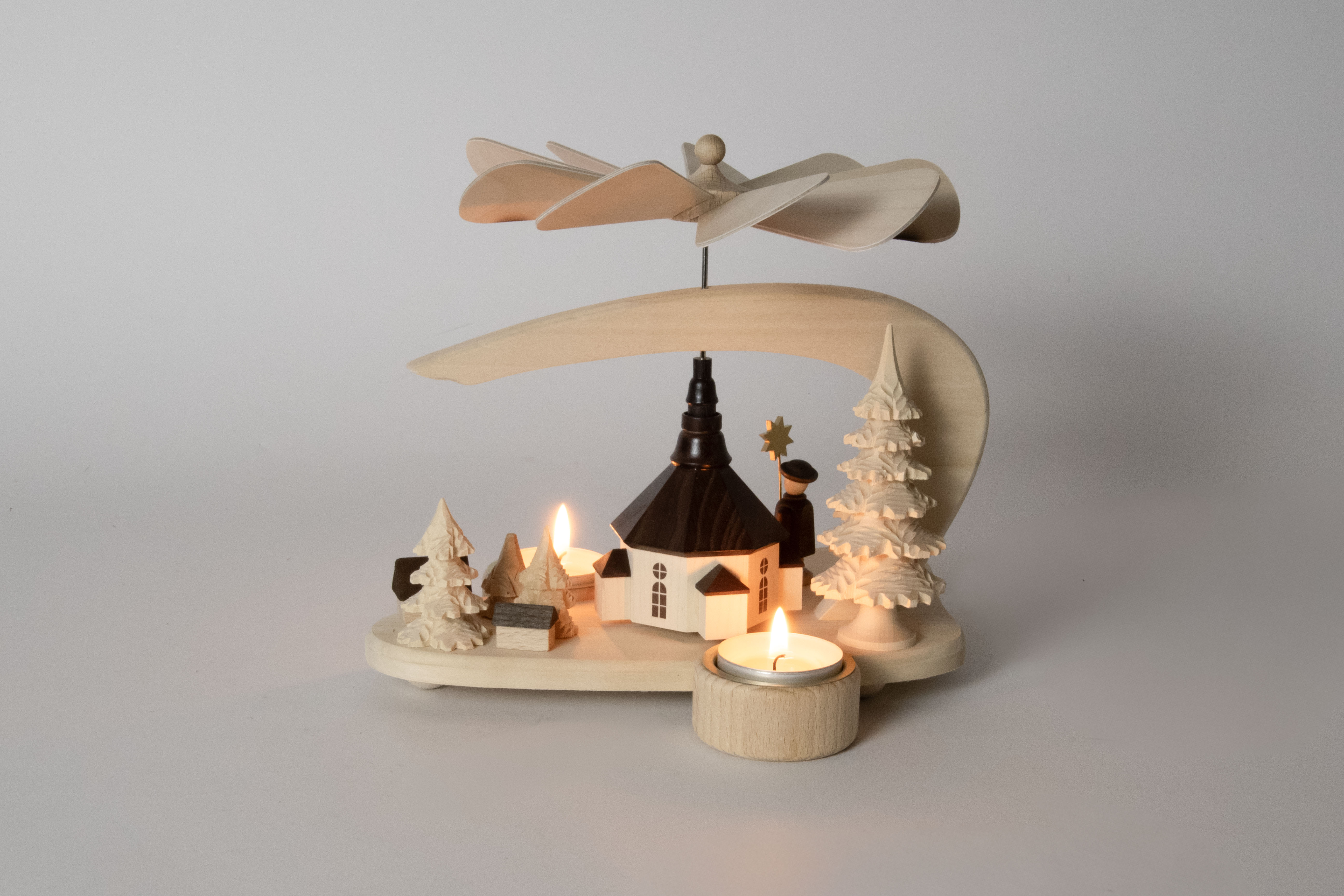 Vacker mini-pyramid i massivt trä med roterande Seiffener Bergkirche. Snidade träd, små hus och en julsångare pryder denna fantastiska pyramid. Julsångaren är beroende på tillgänglighet utrustad med antingen en bok eller en stjärna!