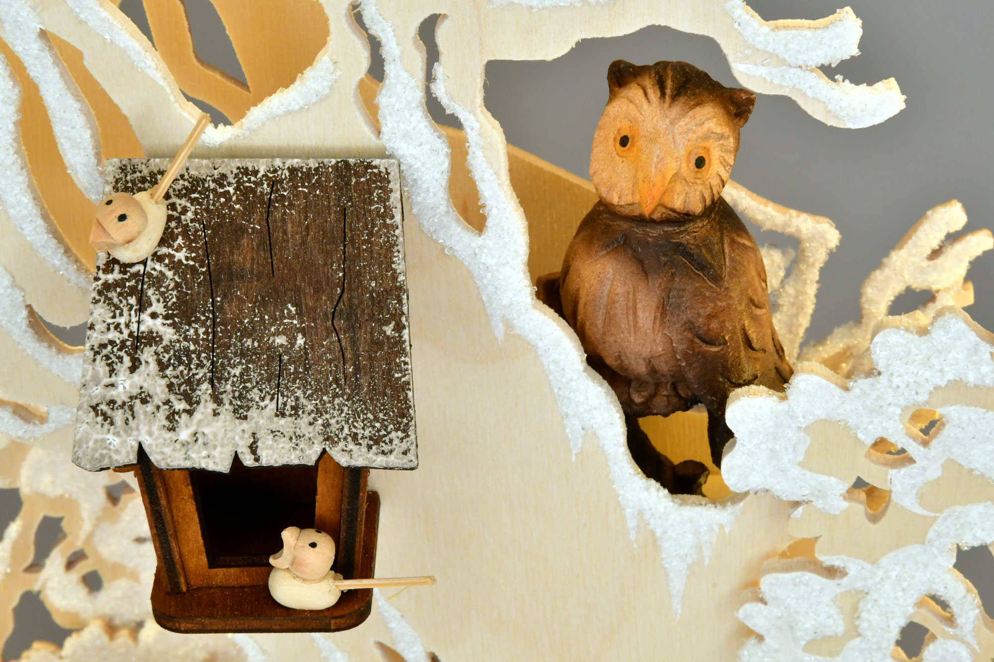 Snidade figurer som ugglor, rådjur och rävar får lampan att nästan vakna till liv. Ett fågelhus med små fåglar pryder ett gammalt träd.