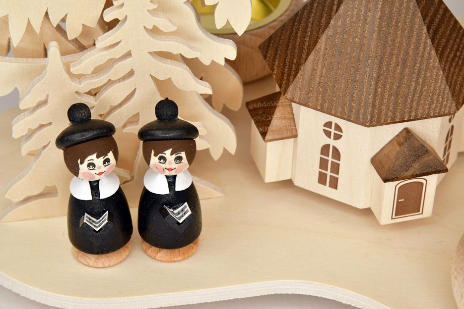 En fröjd för ögat är skogspyramiden med roterande kyrka. Framför kyrkan har tre små julsångare samlats för att sjunga stämningsfulla sånger. Över trädtopparna ser man klockorna ringa. Pyramiden drivs av två tända te-ljus som placeras i de avsedda massiva trä-ljushållarna.